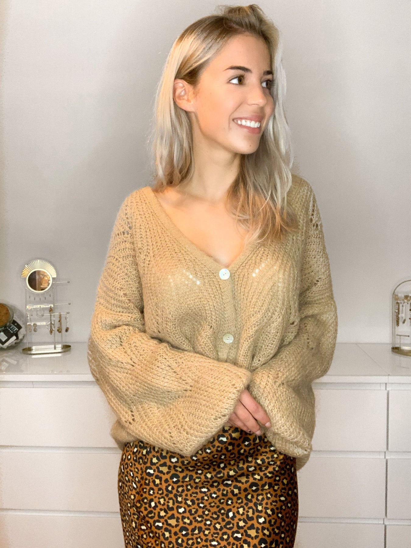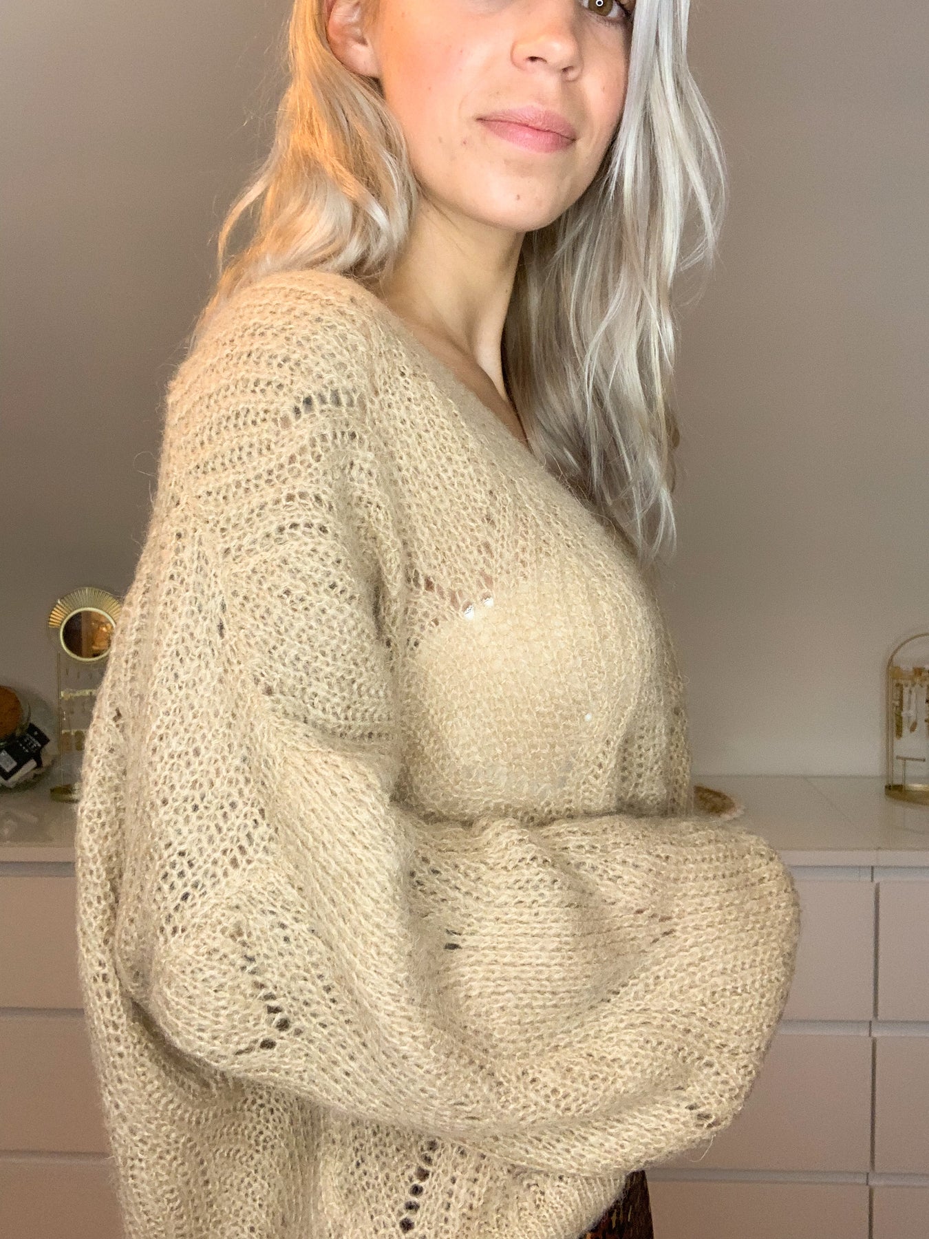 loose model, pearly buttons, stretcher at the sleeves, v-neckline