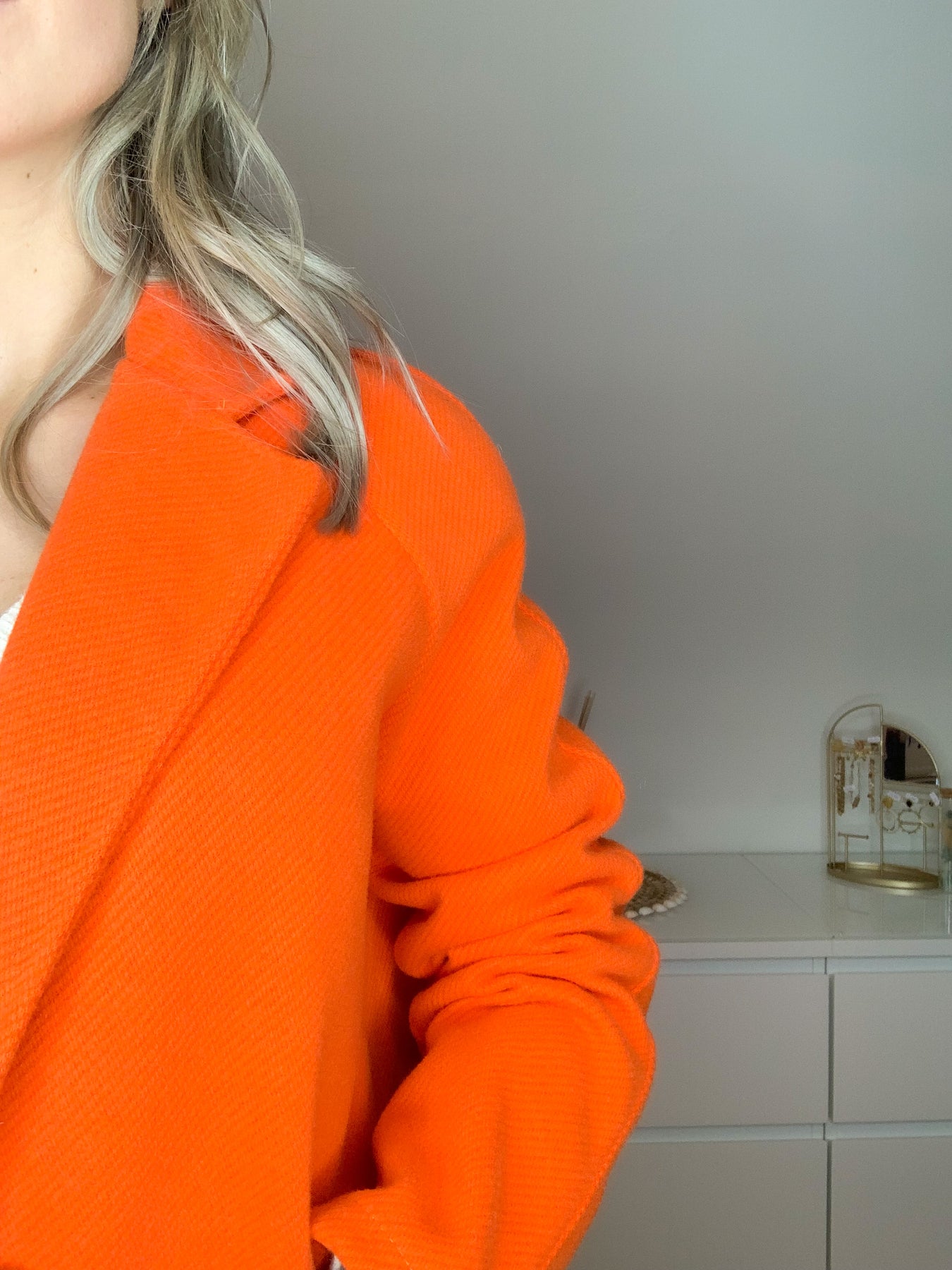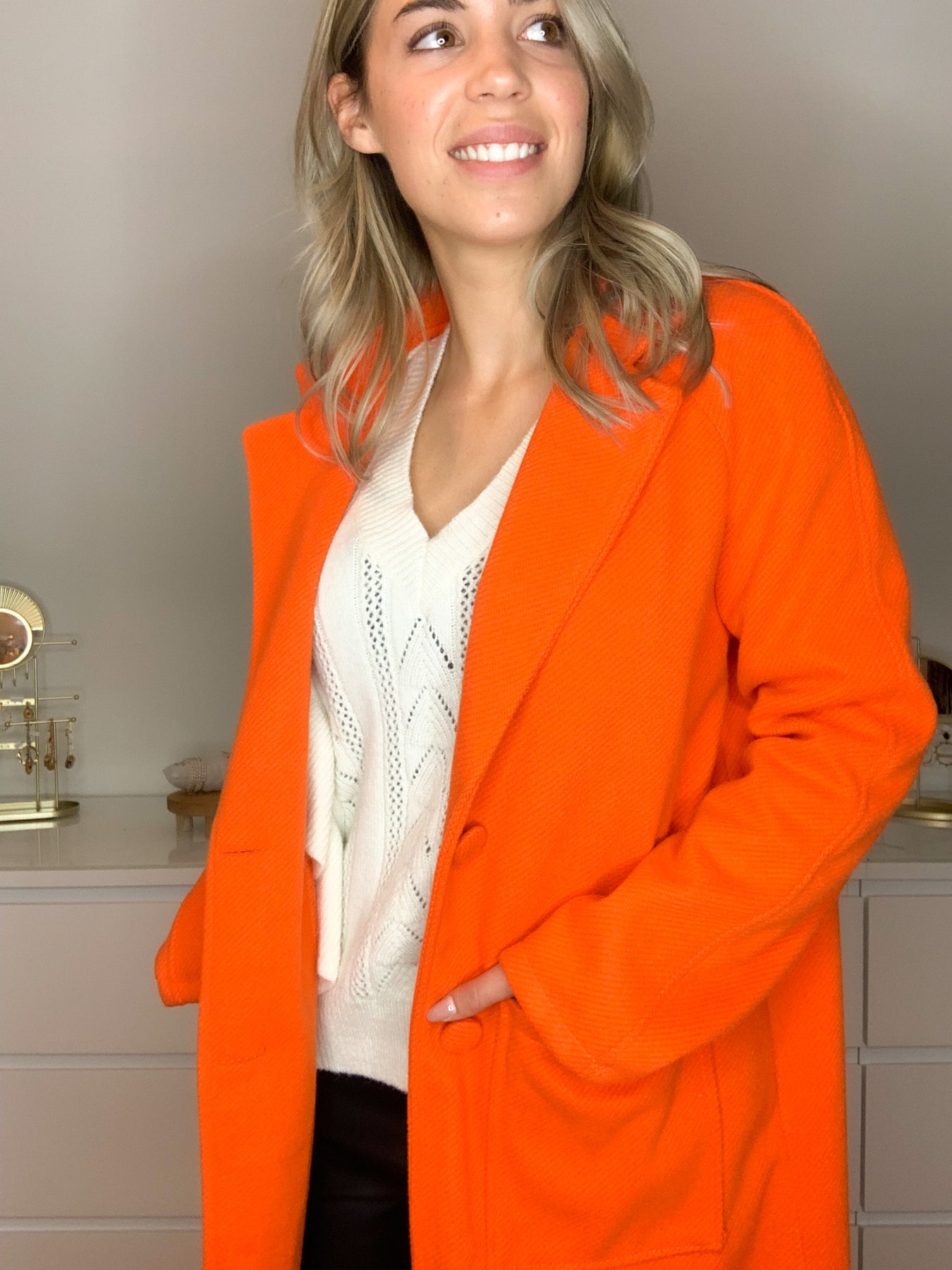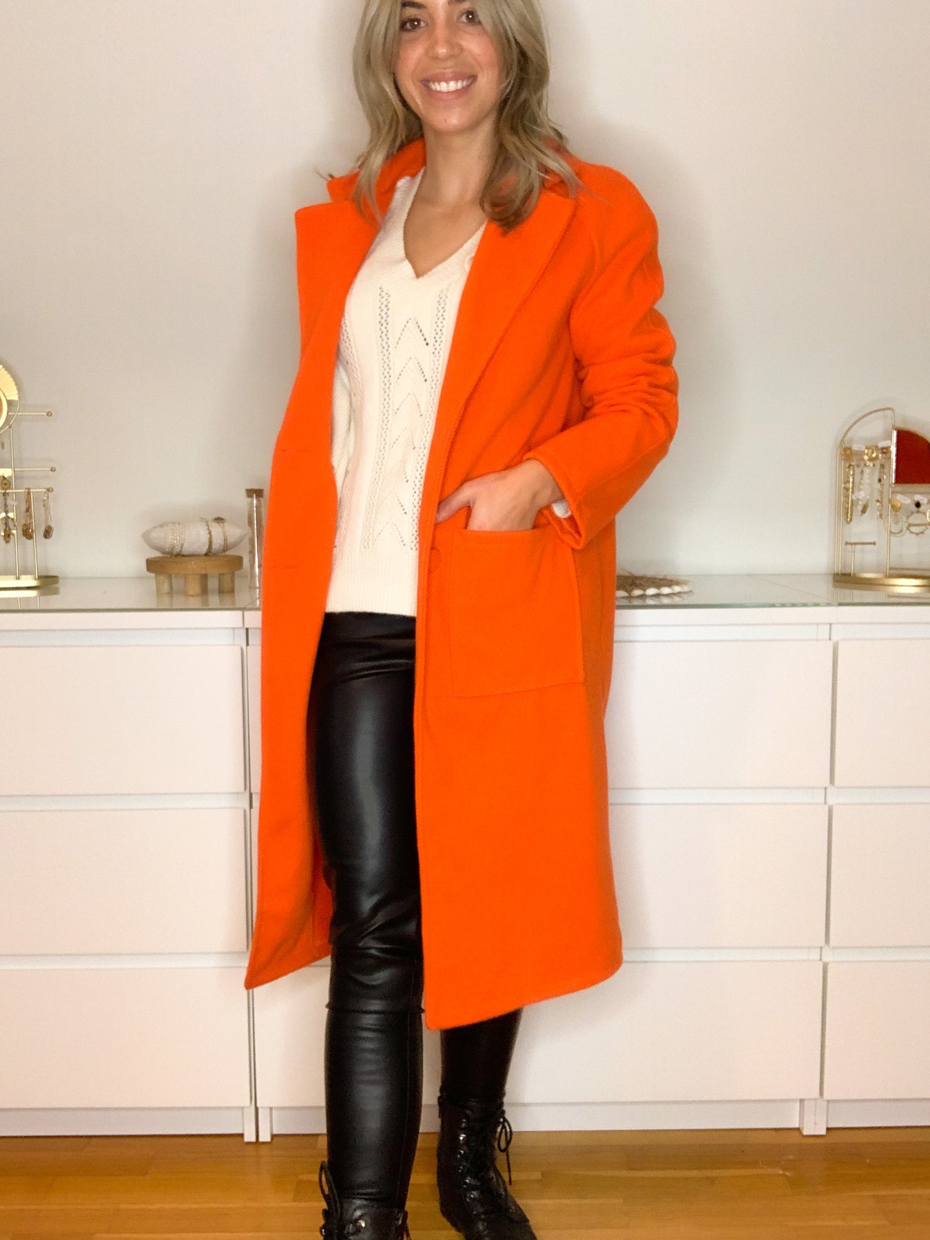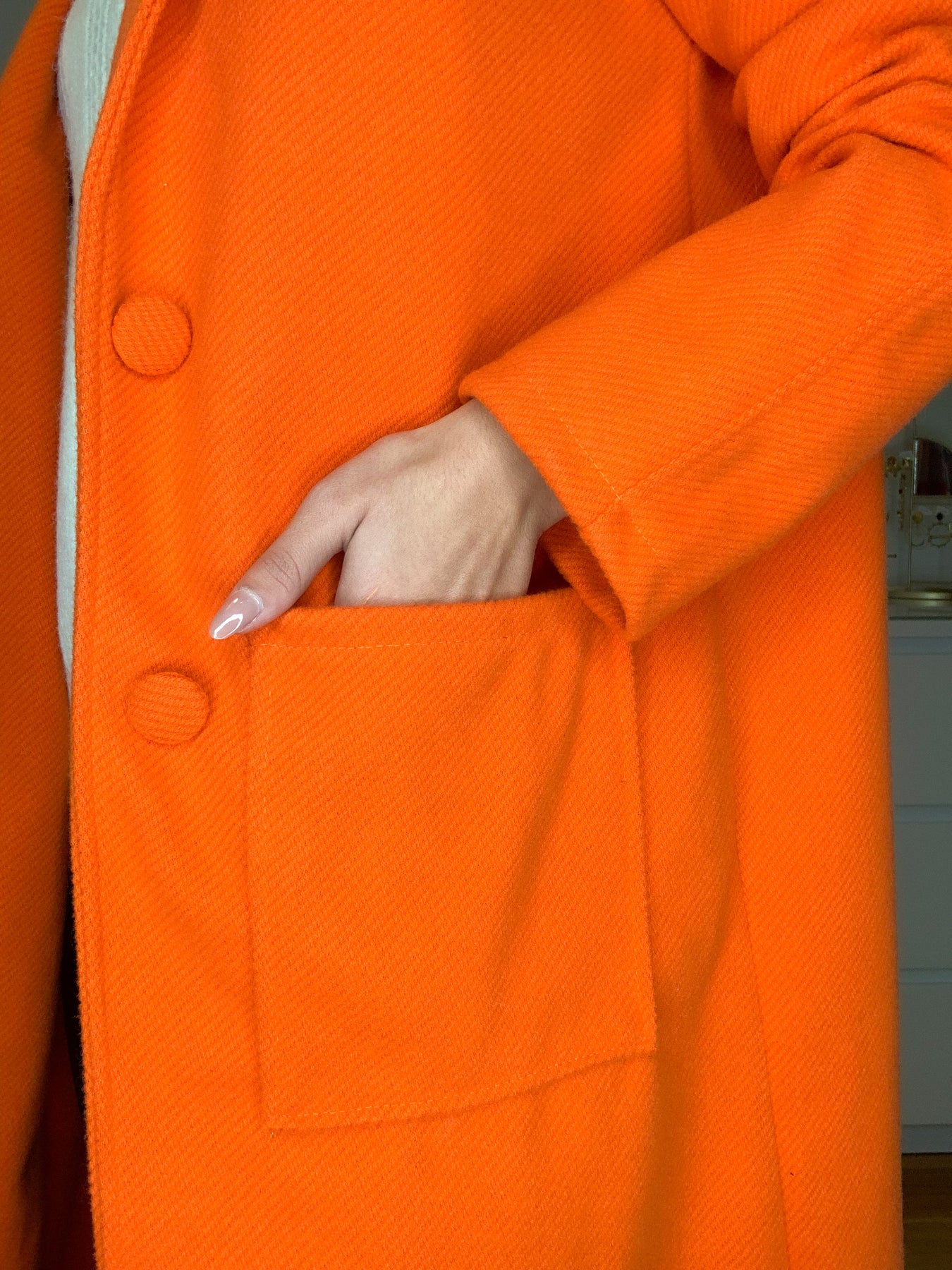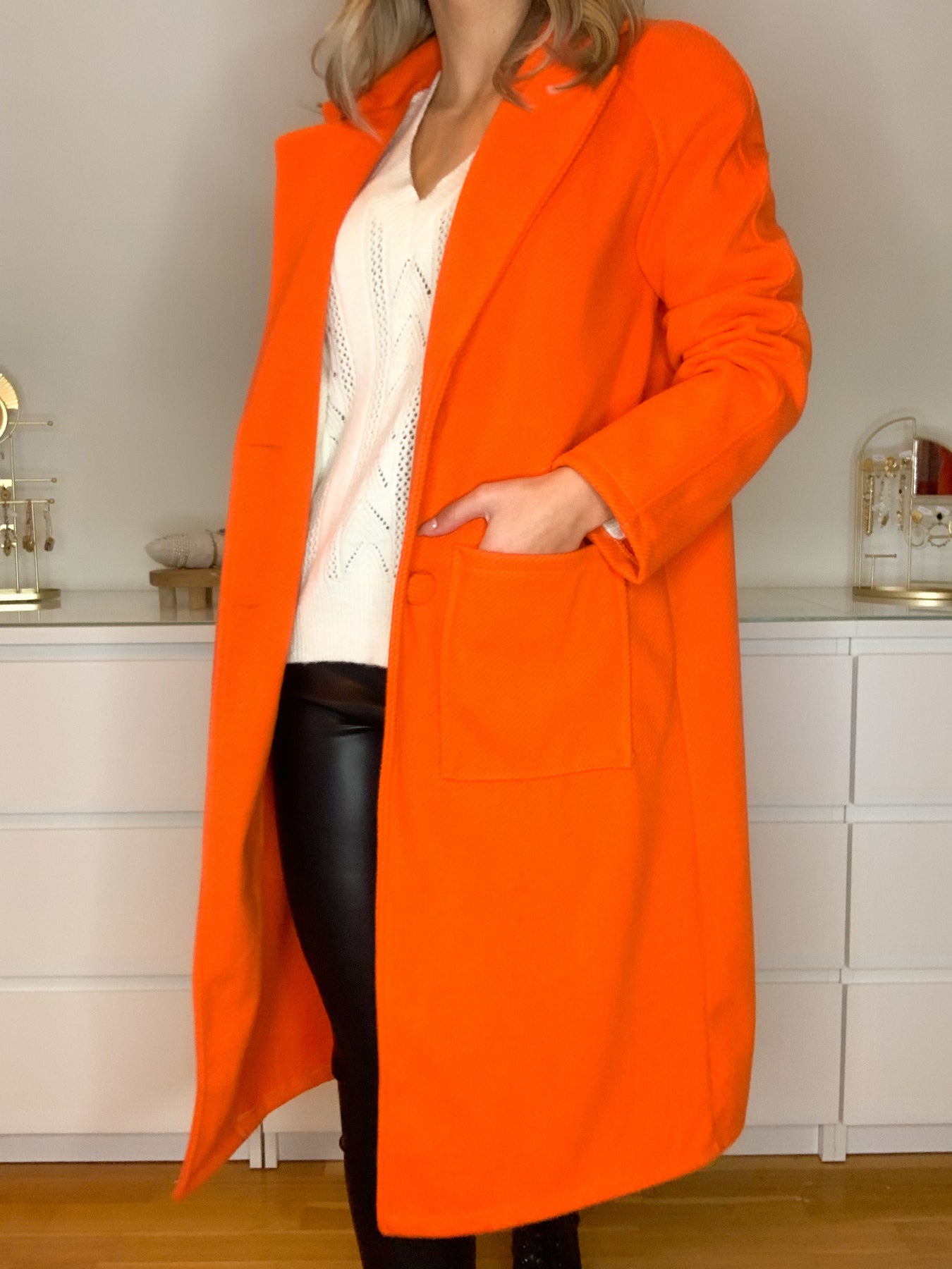 straight and long model, long sleeve, two buttons at the front, two pockets, thick and warm texture